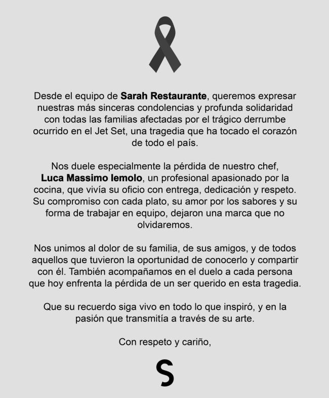 Attraverso un post su Instagram, il team del locale ha espresso le più sincere condoglianze a tutte le famiglie che hanno subìto delle tragiche perdite, riferendosi in particolare ai cari del loro chef Luca Massimo Iemolo. Nel post si legge quanto tutto lo staff del ristorante stimasse il cuoco catanese.