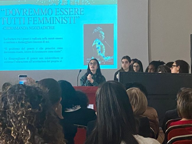Con un excursus partito dalla cultura classica e giunto agli anni duemila, la classe ha avvinto l’uditorio sia con immagini e musiche in grado di comunicare emozioni che con riflessioni esemplari, che riportiamo in sintesi: “Guardare al passato serve a ricordarci che la violenza di genere affonda le sue radici in secoli di squilibri di potere, stereotipi e sistemi patriarcali… Educare significa decostruire queste eredità culturali, riconoscere i segnali della violenza e sviluppare strumenti per contrastarla, trasformare la comunità, promuovere rispetto, uguaglianza e responsabilità collettiva…è un atto che infrange un silenzio millenario…e che deve partire dalla conoscenza del passato, deve transitare attraverso l’educazione, deve arrivare alla costruzione di una società che rifiuti ogni forma di abuso”.