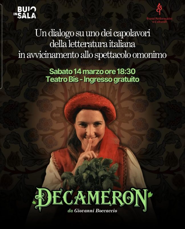 Lo spettacolo sarà preceduto da un incontro culturale dedicato al Decameron, tra riflessioni e momenti performativi, in programma sabato 14 marzo alle 18.30 al Teatro Bis, la sala teatrale attigua alla scuola d’arte Buio in Sala.