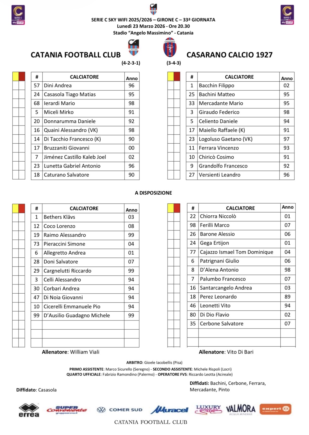 Sostituzioni: triplo cambio Catania: dentro Celli, Di Noia e D’ausilio per Donnarumma, Quaini e Bruzzaniti; dentro Perez per Grandolfo; Versienti-Cerbone; Caturano-Pieraccini; Maiello-Leonetti; Giraudo-Cajazzo;