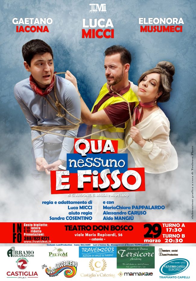 Domenica 29 marzo, alle ore 17.30 (già sold out) e 20.30, sul palco del Teatro Don Bosco andrà in scena l’esilarante commedia “Qua nessuno è fisso”, scritta da Corrado Ardone, Ettore Massa e Massimo Peluso, originariamente in napoletano e riadattata in questa versione in siciliano.