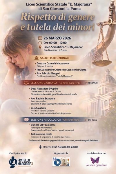 SAN GIOVANNI LA PUNTA – La delicata tematica del rispetto di genere e della tutela del minori è stata affrontata durante un incontro con i ragazzi della scuola, tenutosi lo scorso giovedì 26 marzo. Organizzato dal Liceo “Ettore Majorana”, grazie al lavoro svolto dai docenti Monica Giunta e Alessandro Chiara e con il patrocinio dell’ Associazione “Fratello Maggiore 3”, il convegno ha visto la partecipazione di autorevoli relatori.