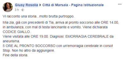 La donna ha voluto denunciare l’esperienza vissuta al pronto soccorso dell’ospedale di Marsala pubblicando il post anche sulla pagina ufficiale della città del Trapanese presente sul noto social network.