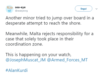 “Un altro minorenne ha tentato di saltar giù dalla nave nel disperato tentativo di raggiungere la costa”, si legge su Twitter. Mentre l’Italia cerca di uscire da una complessa crisi di governo, sembra che Malta abbia al momento rifiutato ogni responsabilità. Il tweet di Sea Eye si conclude con un appello al primo ministro maltese, Joseph Muscat e alle forze armate dell’isola: “Questo sta succedendo sotto i vostri occhi”.