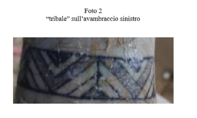 In particolare i tre tatuaggi in questione rappresentano un “tribale” sull’avambraccio sinistro, la sagoma di un pipistrello con alcune lettere illeggibili tra le scapole ed una lettera “M” sul braccio destro.