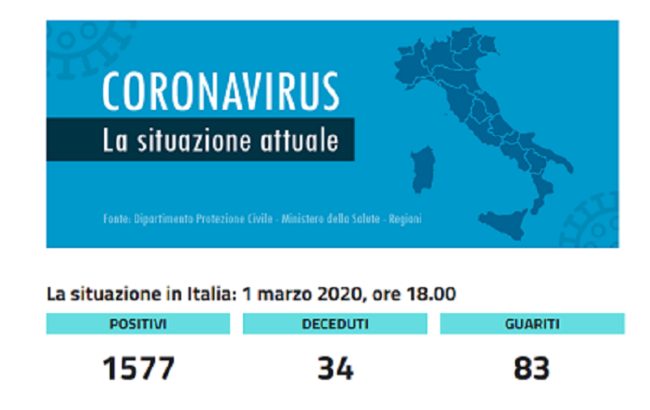 Nell’ambito del monitoraggio sanitario relativo alla diffusione del Coronavirus sul territorio nazionale, al momento 1.577 persone risultano positive.