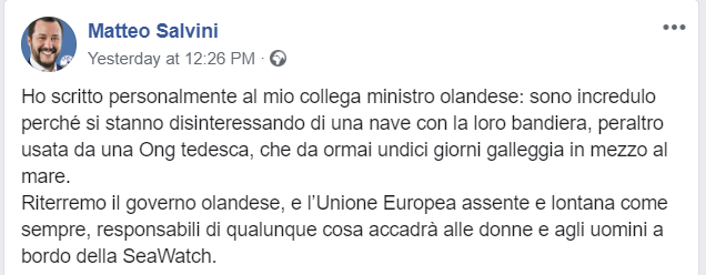 Già ieri, il ministro dell’Interno, Matteo Salvini, si era espresso sulla vicenda scagliandosi contro l’Unione Europea e le sue azioni in merito. Su Facebook, la sua posizione è stata chiarita attraverso un post: “Ho scritto personalmente al mio collega ministro olandese: sono incredulo perché si stanno disinteressando di una nave con la loro bandiera, peraltro usata da una Ong tedesca, che da ormai undici giorni galleggia in mezzo al mare. Riterremo il governo olandese, e l’Unione Europea assente e lontana come sempre, responsabili di qualunque cosa accadrà alle donne e agli uomini a bordo della SeaWatch”.