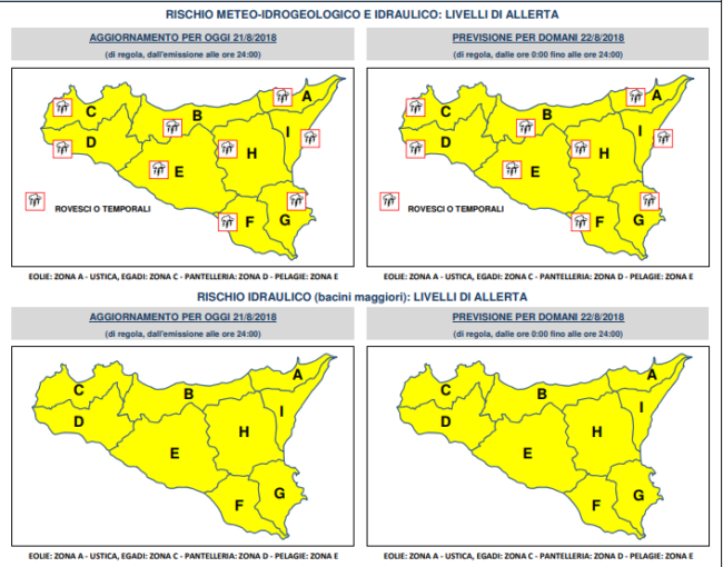 Anche per la giornata di domani, infatti, la protezione civile della Regione Siciliana hanno annunciato un’allerta gialla per tutte le province siciliane, con elevata probabilità di rovesci, anche di forte intensità.