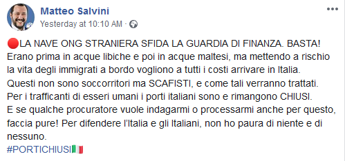 Un allarme che arriva poche ore dopo l’ennesima presa di posizione in merito del leader della Lega, che già nei giorni scorsi aveva definito la Sea Watch “non inoffensiva”, sui social: “La nave Ong straniera sfida la Guardia di Finanza. Basta! Erano prima in acque libiche e poi in acque maltesi, ma mettendo a rischio la vita degli immigrati a bordo vogliono a tutti i costi arrivare in Italia. Questi non sono soccorritori ma scafisti, e come tali verranno trattati. Per i trafficanti di esseri umani i porti italiani sono e rimangono CHIUSI”.