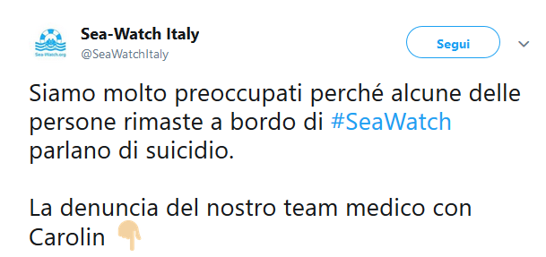 La situazione nelle ultime ore si sarebbe fatta ancora più preoccupante, visto che alcune persone a bordo della Sea Watch, proveniente dalla Libia, avrebbero perfino minacciato di togliersi la vita. “Siamo molto preoccupati perché alcune delle persone rimaste a bordo di #SeaWatch parlano di suicidio“, si legge in un tweet di Sea Watch Italy.