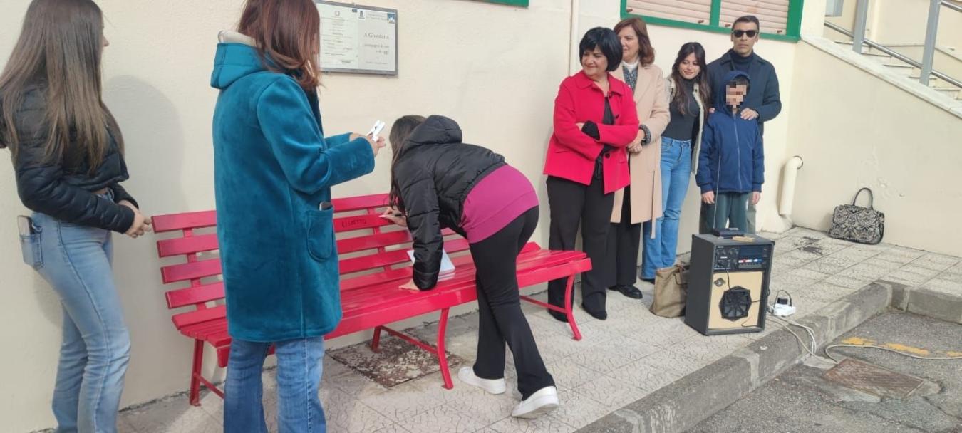 La cerimonia si è conclusa con l’inaugurazione della Panchina Rossa, collocata nel cortile della scuola, e con una dedica sulla targa “Ti amo da Vivere”.
