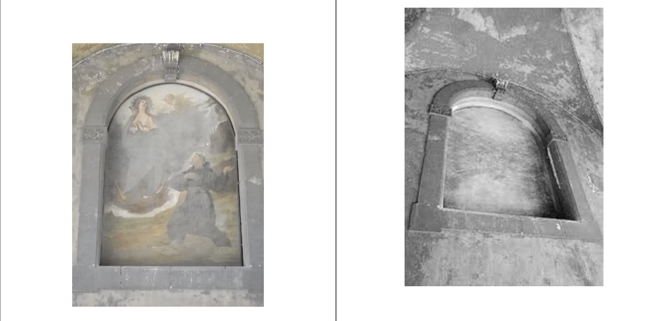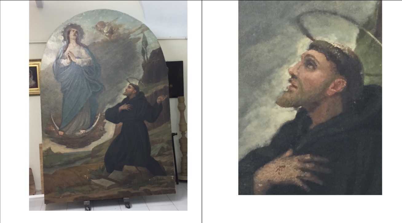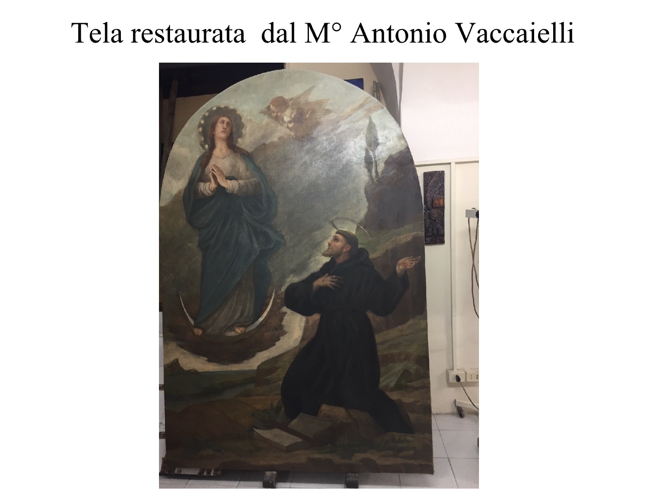 La tela, collocata per decenni nella nicchia dell’arco settecentesco, aveva subito gravi danni. L’intervento di restauro è stato reso possibile grazie all’impegno del Maestro Restauratore Antonio Vaccaielli, accreditato presso la Soprintendenza ai Beni Culturali, e al contributo di numerosi donatori. Il dipinto (misure 1,56 x 2,30 m), attribuito al pittore catanese Mario Ragusa e datato 1955, raffigura San Francesco in ginocchio davanti alla Vergine Immacolata, attorniata da una nube e due angeli, con un paesaggio di agavi sullo sfondo e un libro aperto in primo piano.