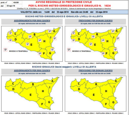 PALERMO – Il maltempo non ha intenzione di arrestare la sua corsa, almeno questo è quanto dichiarato dalla Protezione Civile Regionale che per le prossime ore ha diramato un bollettino meteo di allerta gialla per rischio meteo-idrogeologico.