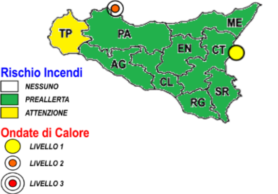 Per quanto concerne il rischio incendi, tutte le province del territorio siciliano sono in preallerta, tranne Trapani nella quale è stata segnala allerta massima.