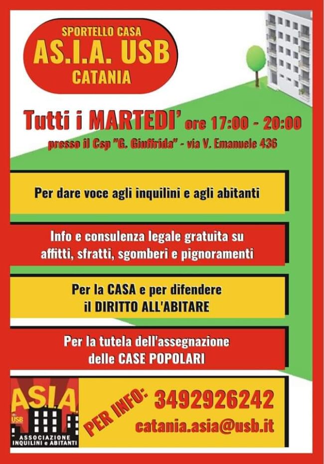 CATANIA – Anche questo martedì 4 agosto lo Sportello Casa ASIA USB Catania è attivo per la consulenza e l’assistenza legale e gratuita sugli affitti, sugli sfratti, sui pignoramenti e per la tutela nell’assegnazione degli alloggi popolari.