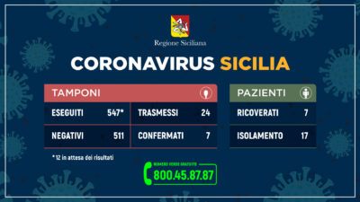 Risultano ricoverati 7 pazienti (tre a Palermo, tre a Catania e uno a Enna) di cui nessuno in terapia intensiva, mentre 18 sono in isolamento domiciliare.