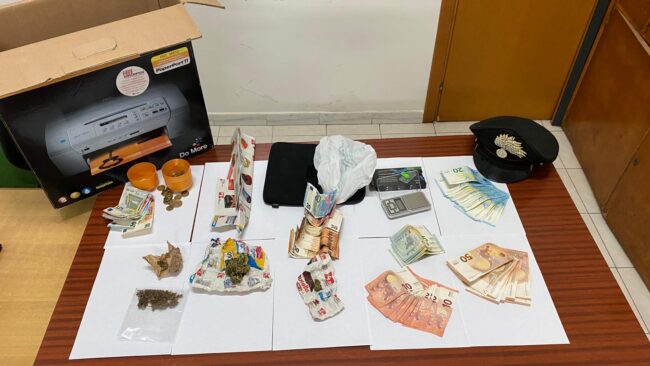L’estensione della perquisizione al locale interrato della sala giochi, poi, ha consentito ai militari di trovare una scatola di cartone, emanante un caratteristico e forte odore resinoso di marijuana, all’interno della quale era custodito un borsello contenente altri soldi per una somma così complessiva di 2.913 euro, ritenuta provento dell’attività di spaccio.