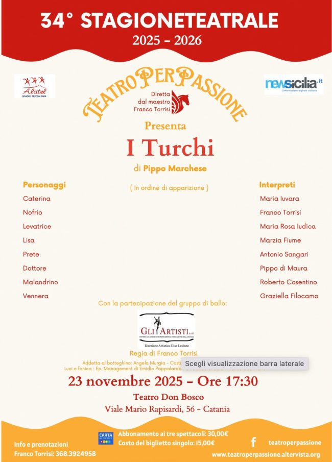 CATANIA – Secondo appuntamento della nuova stagione 2025/2026 con la compagnia teatrale “Teatro per Passione” che andrà in scena con una commedia brillante, “I Turchi” di Pippo Marchese.