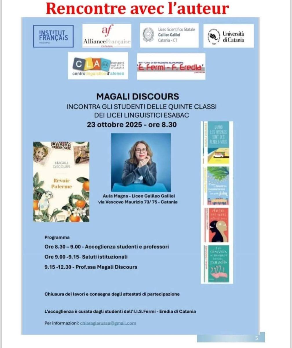Si è svolto il 23 ottobre, presso l’Aula Magna del Liceo Linguistico Galileo Galilei di Catania, l’incontro “Magali Discours incontra gli studenti delle quinte classi dei licei linguistici ESABAC”. Momento educativo e formativo per la scuola diretta dalla Prof.ssa Giuseppina Lo Bianco.