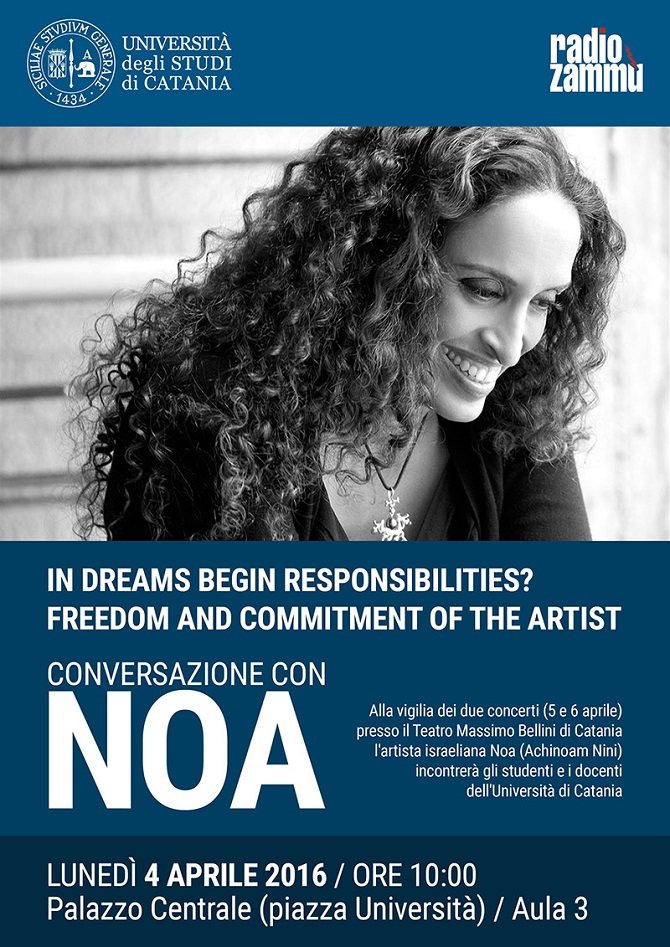 CATANIA – La libertà e l’impegno di un’artista, mischiata a sogni e responsabilità: prende spunto dall’opera di Delmore Scwartz, scrittore statunitense, “Nei sogni iniziano le responsabilità”, la nota cantante israeliana Noa che lunedì 4 aprile alle 10 incontrerà al palazzo centrale dell’università di Catania gli studenti e i docenti dell’Ateneo per una conversazione sul tema “In dreams begin responsibilities? Freedom and commitment of the artist”.