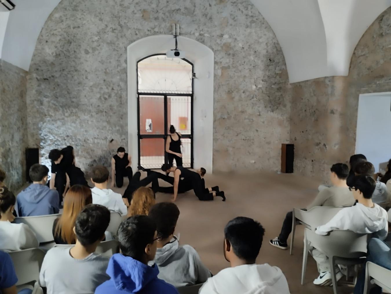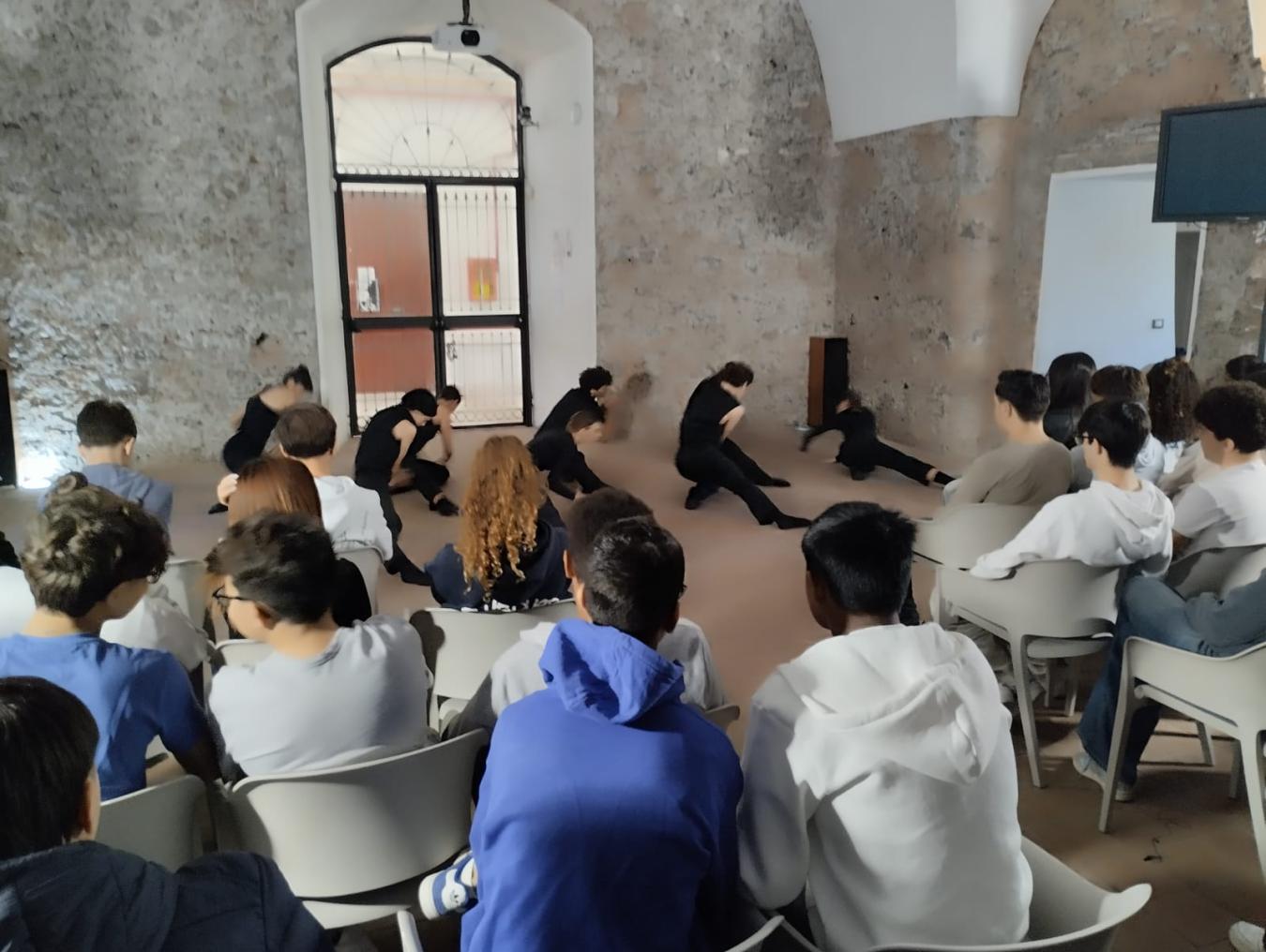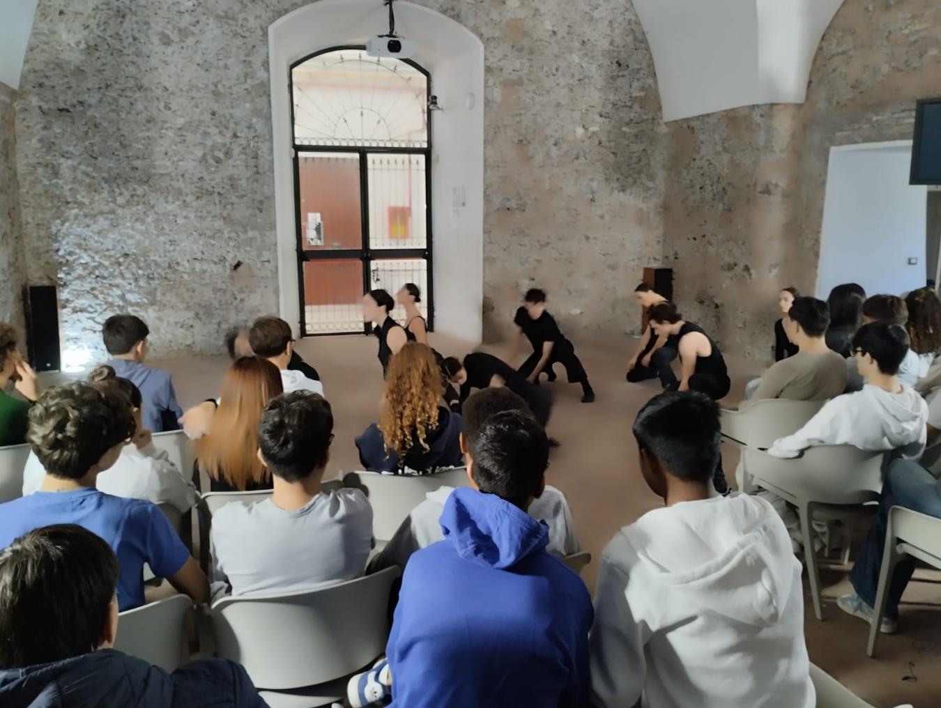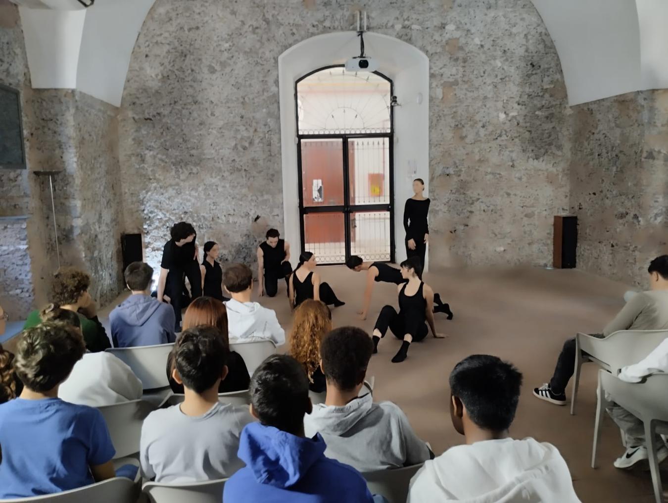 Le alunne e gli alunni del Liceo hanno assistito a uno spettacolo raffinato e coinvolgente, in cui danza contemporanea e contesto antico si sono coniugati dando vita a una performance fitta di relazioni e legami emotivi.