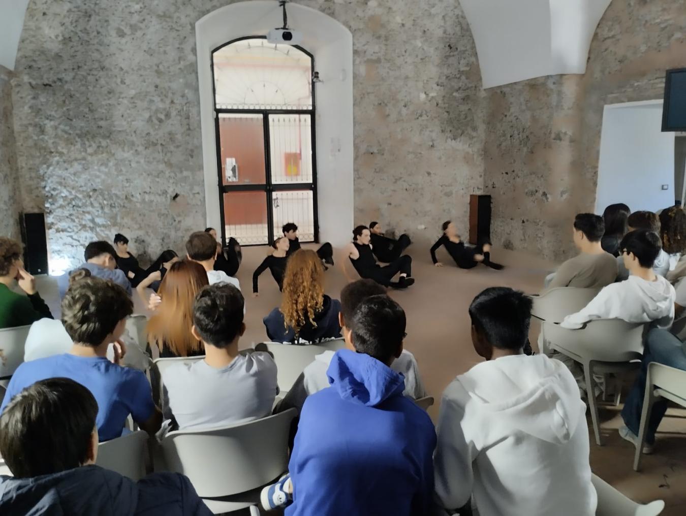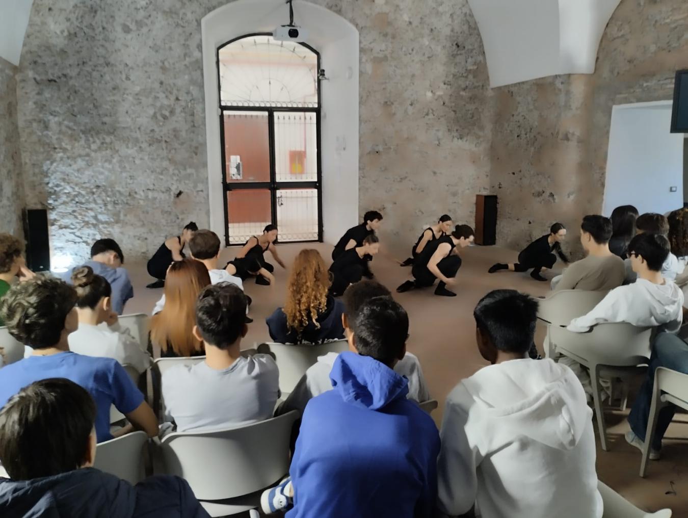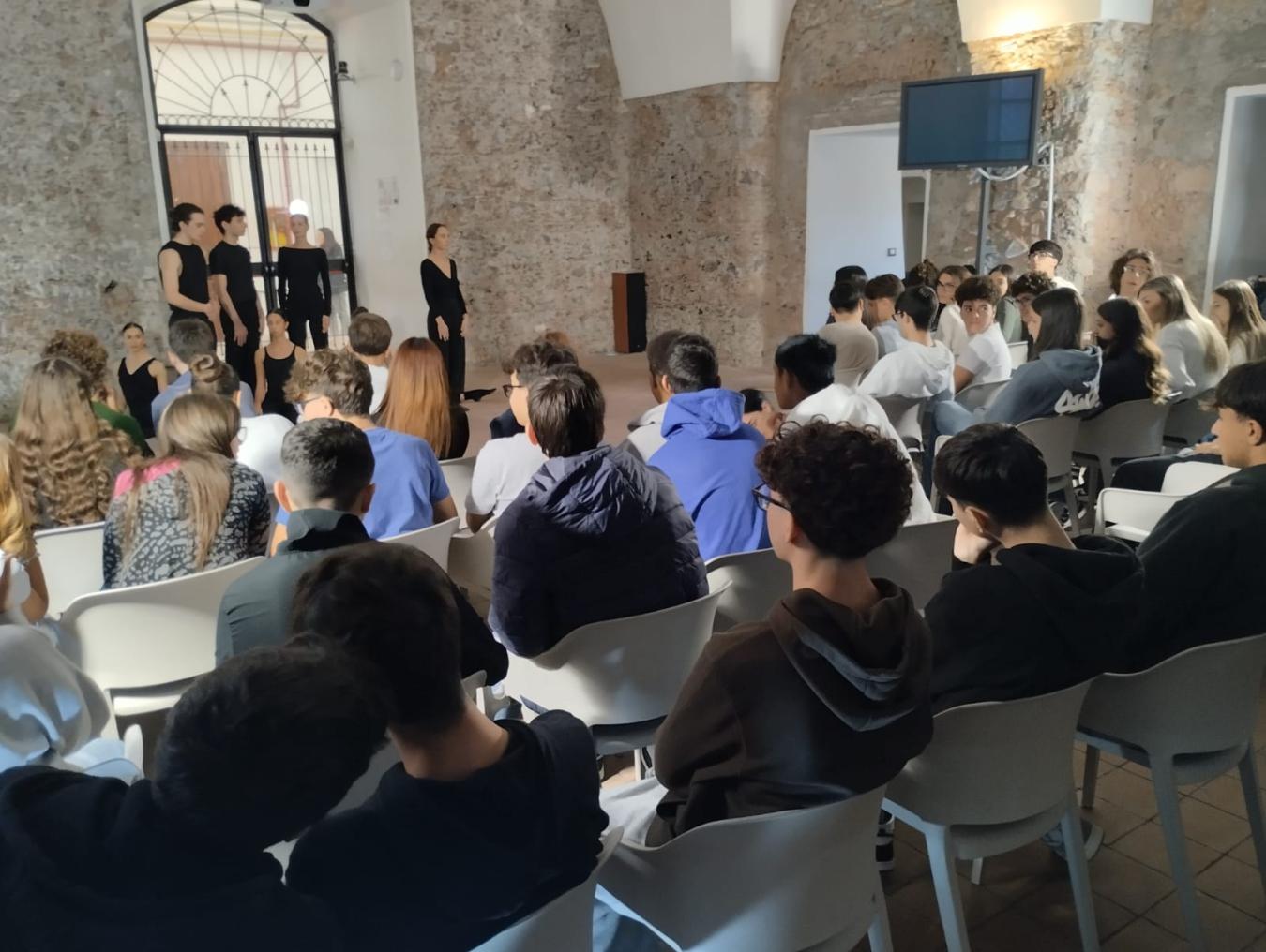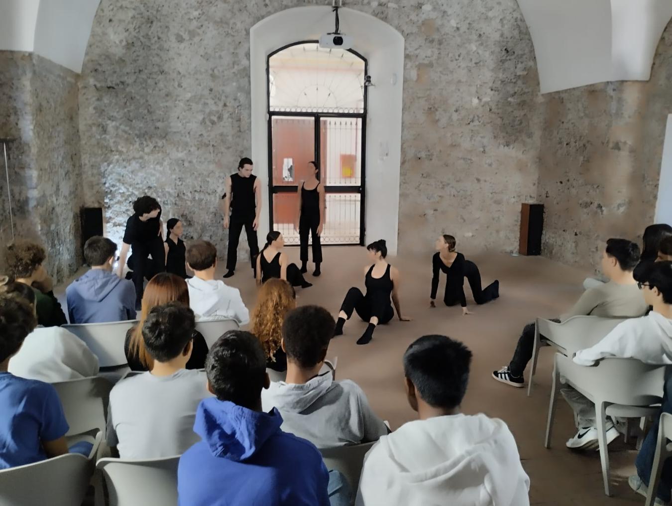 Le alunne e gli alunni del Liceo hanno assistito a uno spettacolo raffinato e coinvolgente, in cui danza contemporanea e contesto antico si sono coniugati dando vita a una performance fitta di relazioni e legami emotivi.