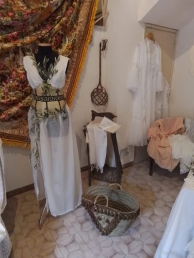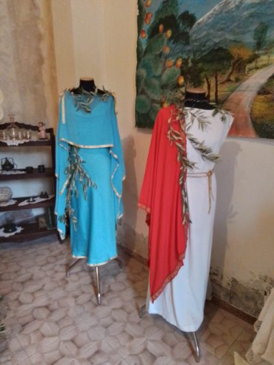 Il primo focus è stato sull’arte greco-romana in Sicilia, culla millenaria dell’albero di ulivo. Tre abiti in esposizione rendono omaggio all’età classica: realizzati con tessuti leggeri e morbidi drappeggi, richiamano la purezza del bianco del Chitone, l’intensità dell’azzurro del Peplo e il rosso del mantello. Dettagli come cinturoni sagomati, corde, foglie di alloro dorate e gioielli sfavillanti rivoluzionano il concetto di moda, liberando le forme femminili e trasformando il corpo in un’espressione vivente di arte e bellezza.