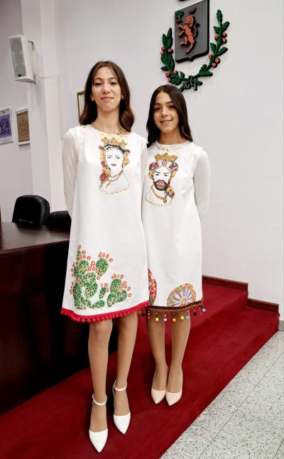Il percorso ha proseguito con una vibrante celebrazione della cultura popolare siciliana. Due studentesse indossano due abiti che incarnano lo spirito dell’isola: semplici tuniche bianche che ritrovano nuova vita grazie a disegni dipinti a mano. Un’opera di valorizzazione del patrimonio culturale che fa sfilare teste di moro, carretti siciliani, fichi d’india, maioliche di Caltagirone, limoni, coffe, ricami, pizzi e merletti, trasformandoli in ricercati e sfiziosi outfit che gridano “Sicilianità!”.