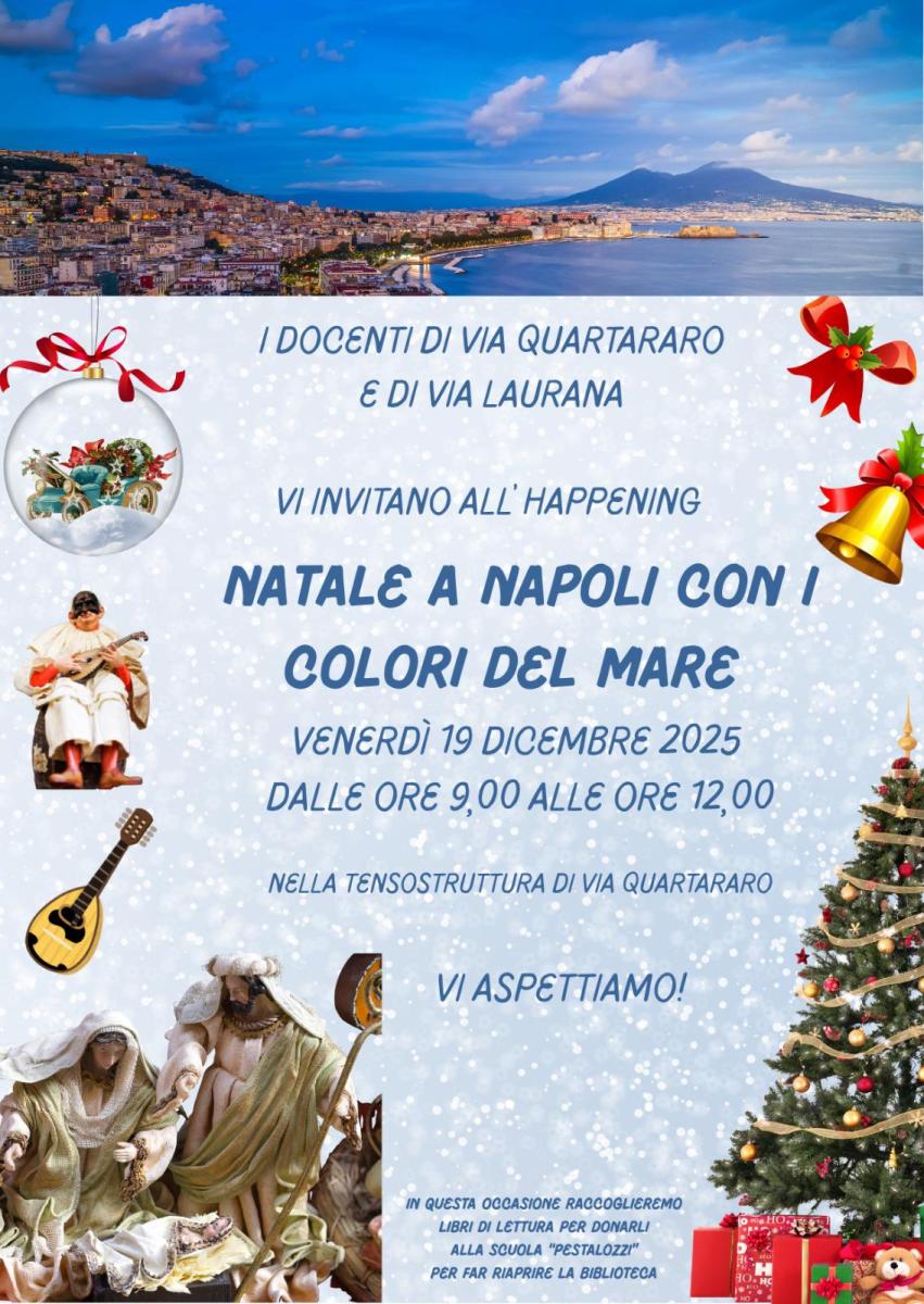 Il tema dell’evento “Natale a Napoli con i colori del mare”, è stato il punto d’arrivo di un percorso intenso e appassionante che ha accompagnato alunni e docenti per mesi. Si è trattato di un Progetto organizzato e gestito dalle docenti della scuola Secondaria di Primo grado: Anna Benintende, docente di Arte, Patrizia D’Amico, docente di Lettere e Giuseppa Nicolosi, docente di Musica. La prima fase è stata conoscitiva , infatti gli alunni hanno scoperto, analizzato, letto, lavorato con la creatività dell’arte e della simbologia, la musica popolare napoletana, le tradizioni popolari con i simboli, allo di comprendere le caratteristiche culturali della città di Napoli, facendo immergere gli studenti nella sua anima profonda, per poi immaginare e realizzare un Natale ambientato in quella città straordinaria, capace di unire storia, arte, fede e vita quotidiana.