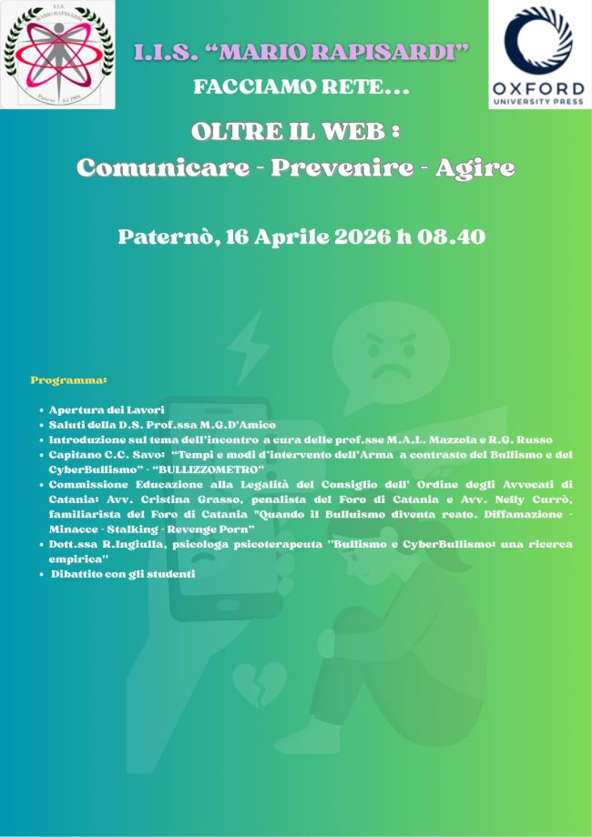 PATERNÒ – “Facciamo rete… oltre il web-Comunicare-Prevenire-Agire” è il titolo di un’importante conferenza che si è tenuta lo scorso giovedì 16 aprile, dalle ore 8.30 alle 10.40, presso l’Aula Magna dell’Istituto di Istruzione Superiore “Mario Rapisardi” di Paternò, con i docenti e gli alunni del primo, secondo e terzo anno del Liceo Classico ed Artistico.