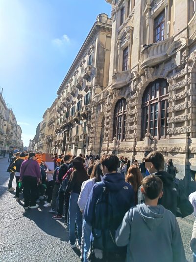 La manifestazione si è trasformata in un pellegrinaggio. Una delegazione di studenti della scuola primaria e della scuola secondaria di primo grado dell I.C. “F. De Roberto “ di Catania, accompagnati dalle insegnanti Lucia Bongiorno, Antonella Motta, Carmen Gusmano, Elena Caserta, dall’assistente alla comunicazione Chiara Spitaleri, dalle prof.sse Agata Platania, Ilenia Rigliaco e Florinda Vergata, si è unita alla lunga e colorata processione di partecipanti che si è snodata per le vie del centro cittadino, guidata da padre Roberto Mangiagli, scortata dalle Forze dell’Ordine, verso la Basilica Cattedrale. I giovani sono stati accolti dall’Arcivescovo Mons. Luigi Renna che ha rivolto loro parole di incoraggiamento: