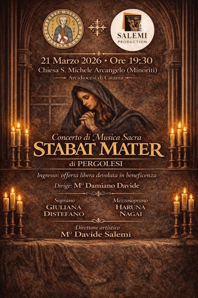 CATANIA – Un grande appuntamento con la musica sacra nel cuore della città. Sabato 21 marzo alle ore 19.30, nella suggestiva Chiesa di San Michele Arcangelo ai Minoriti, si terrà il concerto “Stabat Mater”, organizzato dalla Salemi Production del maestro Davide Salemi in collaborazione con l’Arcidiocesi di Catania.