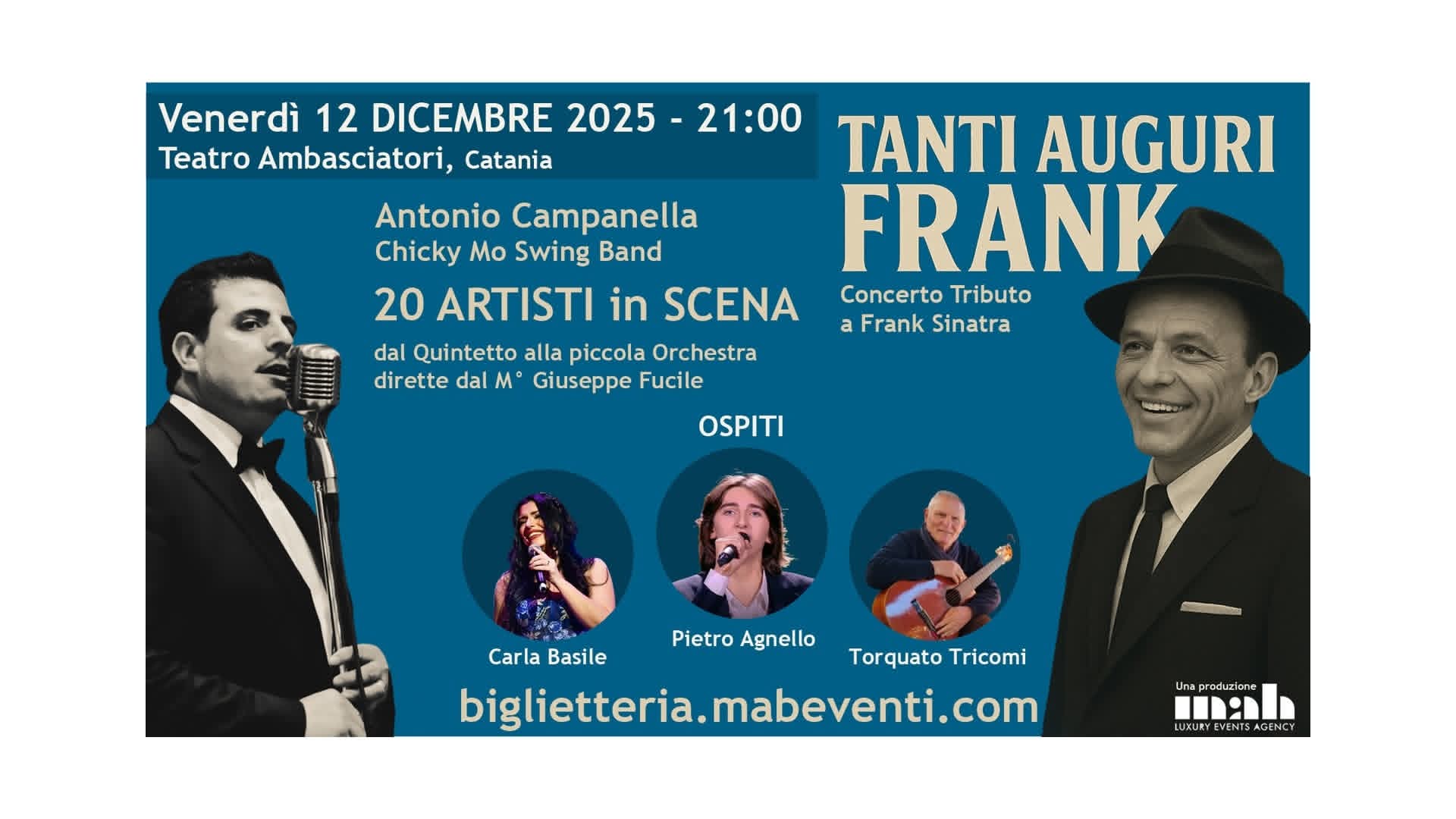 CATANIA – Cresce l’attesa per “Tanti Auguri Frank”, il grande concerto dedicato a Frank Sinatra e firmato da Antonio Campanella e dalla Chicky Mo Swing Band. L’evento, prodotto da Mab Luxury Events, andrà in scena venerdì 12 dicembre alle ore 21 sul palco del Teatro Ambasciatori.