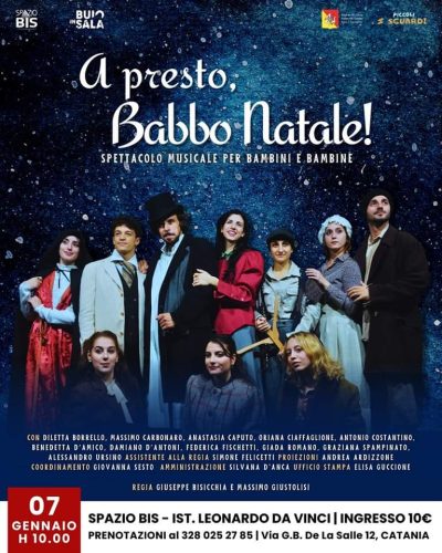 CATANIA – Una storia fatta di buoni sentimenti, musica e tante sorprese per la fiaba musicale “A presto Babbo Natale” della Compagnia Buio in Sala, fondata e diretta dagli attori e registi Massimo Giustolisi e Giuseppe Bisicchia insieme a Silvana D’Anca e Giovanna Sesto, rispettivamente presidente e vicepresidente dell’Associazione.