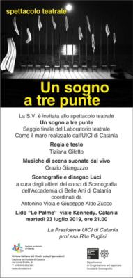 CATANIA – Domani, martedì 23 luglio alle ore 21, al Lido Le Palme di viale Kennedy a Catania andrà in scena “Un sogno a tre punte“, saggio finale del Laboratorio teatrale “Come il mare”, realizzato dall’Unione Italiana dei Ciechi e degli Ipovedenti di Catania, sezione presieduta da Rita Puglisi.