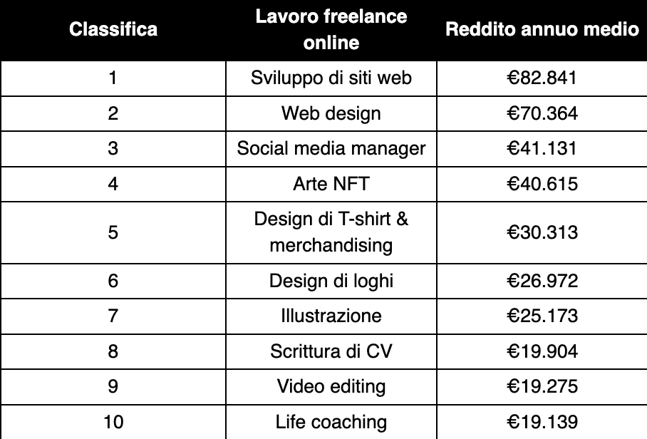Tra le attività che uniscono creatività e digitale compaiono anche l’arte NFT, il design di T-shirt e merchandising e il design di loghi, mentre nella parte bassa della top 10 si trovano lavori come la scrittura di CV, il video editing e il life coaching, che restano comunque valide opzioni per integrare il reddito con un impegno part-time.
