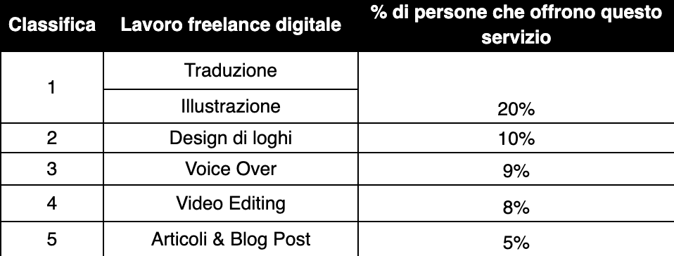 Non sempre, però, ciò che è più richiesto coincide con ciò che è meglio pagato. Secondo l’analisi di Truffa.net, i servizi di traduzione sono i più offerti e richiesti sui marketplace freelance italiani, seguiti dall’illustrazione, che da sola rappresenta circa il 23% delle offerte. Restano molto popolari anche il design di loghi, il voice over, il video editing e la scrittura di articoli e blog post.