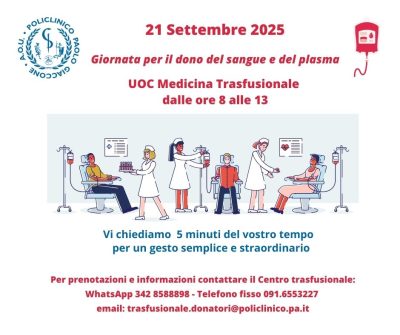 PALERMO – L’importanza di donare sangue e plasma. Apertura straordinaria dell’UOC Medicina Trasfusionale del Policlinico “Paolo Giaccone” di Palermo. L’Unità Operativa Complessa quindi, accoglierà tutti coloro che vorranno donare domenica 21 settembre, dalle 8 alle 13.