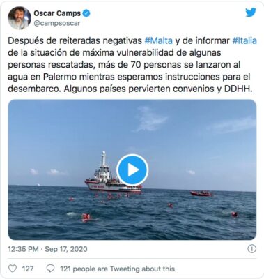 Dopo il diniego da parte dello stato di Malta, le condizioni a bordo del natante si sarebbero aggravate ulteriormente e, stando a quanto riportato da un tweet del fondatore della ong, Oscar Camps, circa 70 persone si sarebbero gettate in acqua.