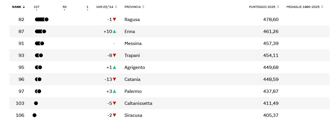 A chiudere la graduatoria nazionale è Reggio Calabria, ultima per il secondo anno consecutivo. Le ultime 22 posizioni sono tutte occupate da province meridionali, confermando un divario strutturale che coinvolge anche la Sicilia.