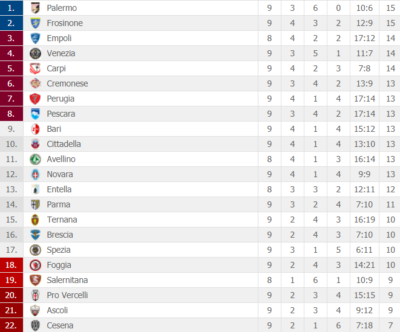 PALERMO (3-5-2): Pomini; Dawidowicz, Struna, Bellusci; Rispoli, Morganella, Murawski, Coronado, Cionek; Embalo, Nestorovski. All. Bruno Tedino