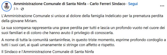 Cresciuta tra Santa Ninfa, Campobello di Mazara e Castelvetrano, Miriam era una ragazza conosciuta e amata, che a maggio avrebbe compiuto 24 anni. La notizia del suo decesso ha colpito duramente la sua terra d’origine. Il Comune di Santa Ninfa ha voluto omaggiarla con un messaggio di cordoglio.